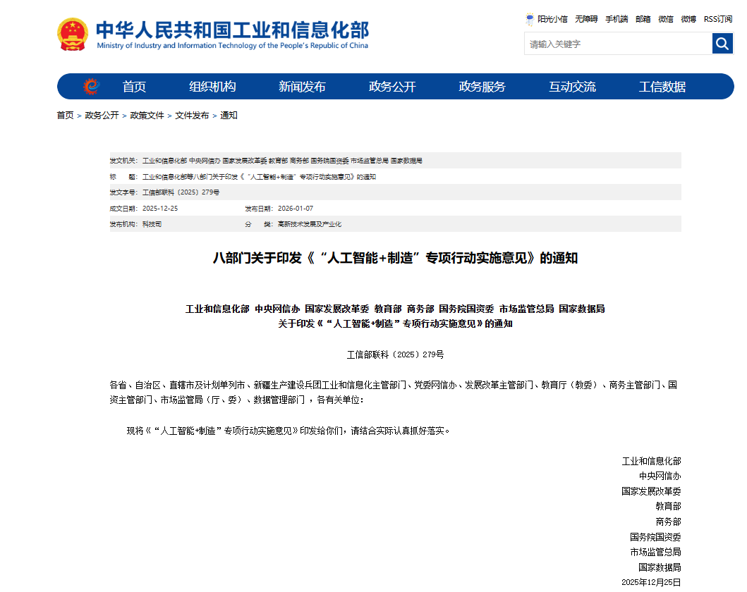 【行業(yè)動(dòng)態(tài)】八部門(mén)聯(lián)合發(fā)布《“人工智能+制造”專項(xiàng)行動(dòng)實(shí)施意見(jiàn)》